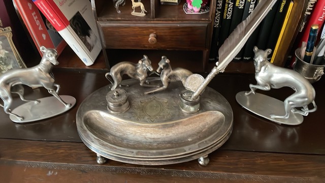 Nun erstrahlt diese seltene und wunderschöne Schreibtischgarnitur in altem , neuen Glanz und erfreut mein Sammlerherz.